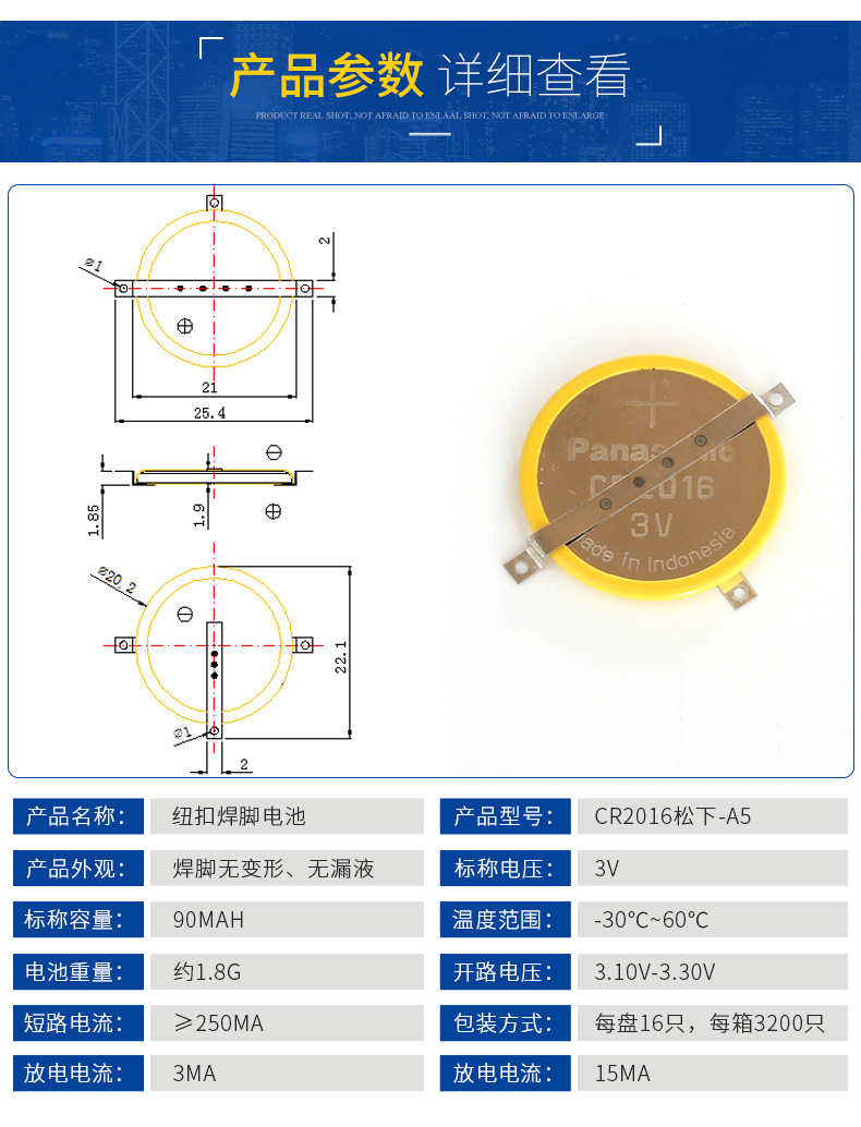 纽扣焊脚电池 CR2016松下-A5